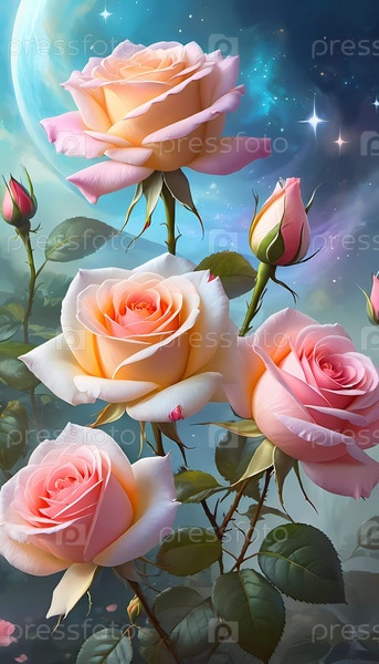 Потрясающая романтическая картина с изящными розовыми и персиковыми розами, цветущими под мягким небесным небом, с лучистым закатом, освещающим сцену. Луна и звезды, вызывающие чувство безмятежности и любви. AI