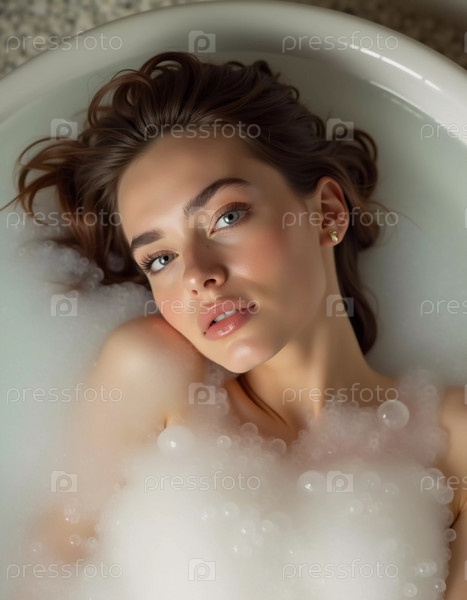 Молодая женщина с распущенными волосами расслабляется в роскошной ванне, наполненной пушистой пеной, создавая спокойную атмосферу в хорошо освещенной ванной комнате в мирный полдень