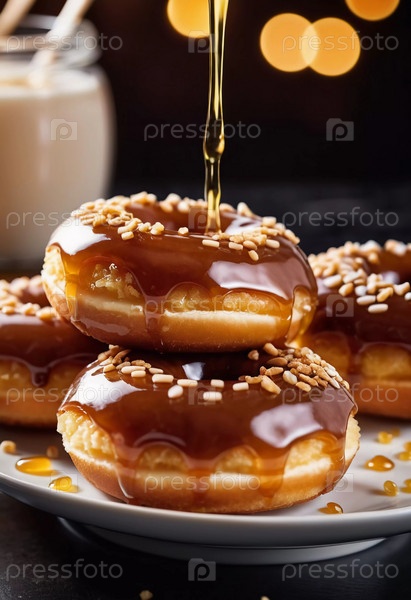 Стопка пончиков с медовой глазурью и глянцевой карамельной глазурью, украшенных хрустящей начинкой, приглашает вас побаловать себя сладким лакомством. Эти пончики идеально подойдут любому любителю десертов. Генеративный ИИ