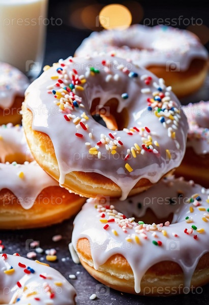 Вкусный ассортимент ванильных пончиков, покрытых кремовой глазурью и разноцветной посыпкой, демонстрирующих свою привлекательную текстуру и сладость в теплой обстановке кафе. Белая глазурь на булочках. Генеративный ИИ