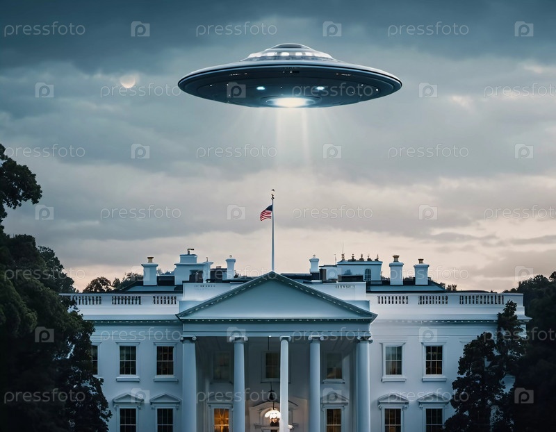 Неопознанный летающий объект парит над Белым домом, освещая территорию сфокусированным лучом света. Драматические облака обрамляют сцену. Генеративный ИИ