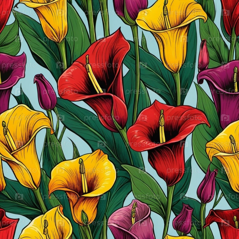 Яркие каллы в оттенках красного, желтого, оранжевого и фиолетового заполняют холст среди сочных зеленых листьев на ярко-синем фоне, создавая привлекательную цветочную композицию. Генеративный ИИ