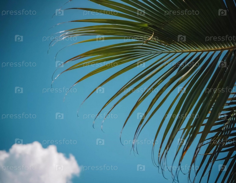 Пальмовые листья тянутся к ярко-синему небу, демонстрируя яркую зелень и нежные белые облака, проплывающие мимо, создавая безмятежную тропическую атмосферу. Генеративный ИИ