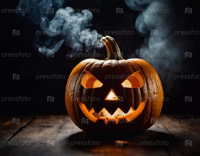 Вырезанная тыква на Хэллоуин имеет угрожающее лицо, подсвеченное изнутри, с дымом, поднимающимся вверх, что усиливает тревожную атмосферу вечера. Генеративный ИИ