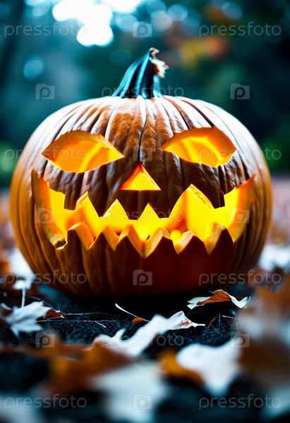 В этот Хэллоуин резная тыква излучает теплое свечение, окруженная маленькими тыквами и красочными осенними листьями, а на заднем плане мерцают праздничные огни. Генеративный ИИ