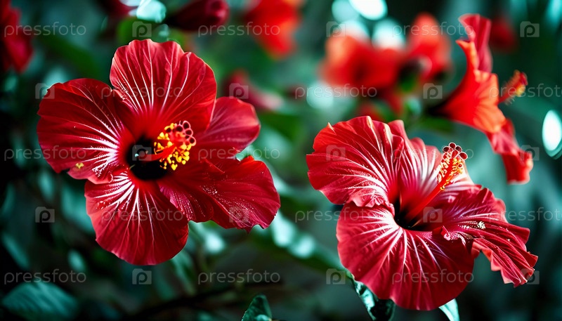 Ярко-красные цветы гибискуса демонстрируют замысловатые лепестки в цветущем саду. Пышная зелень создает яркий фон для их красоты. Гибискус — крупный род растений семейства Мальвовые. AI