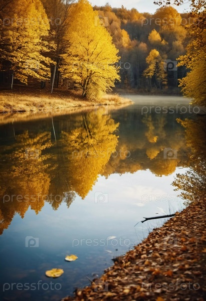 Яркие желтые листья создают потрясающую осеннюю картину вокруг спокойного озера, а отражения отражают листву на поверхности воды, когда день подходит к концу. Генеративный ИИ