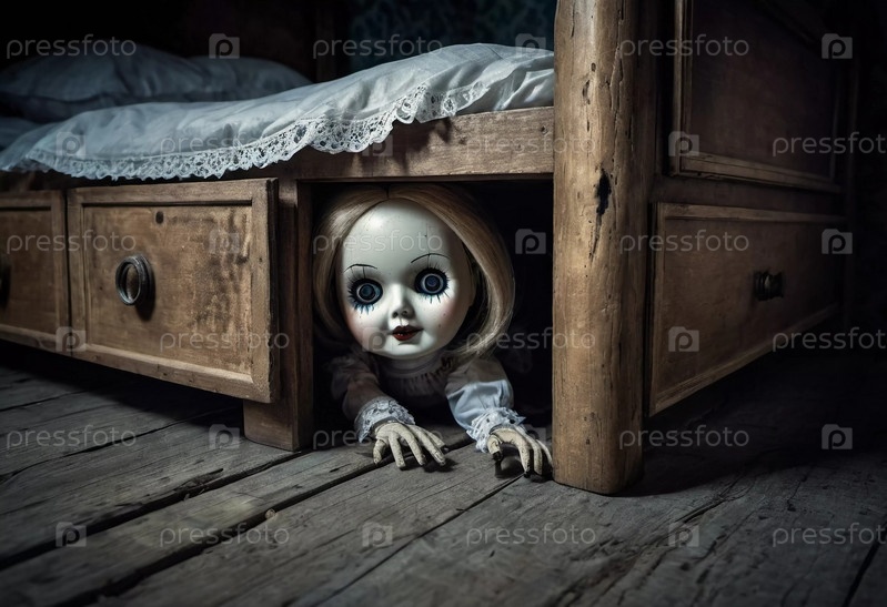 Тревожная старая кукла с тревожными глазами и винтажной одеждой выглядывает из-под ретро-кровати, вызывая жуткое чувство в тускло освещенном пространстве. Страшная кукла для ужасов и Хэллоуина. Генеративный ИИ