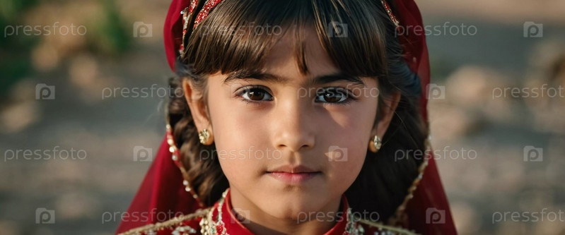 Девочка 5 лет таджикской национальности стоит на улице, одетая в традиционную одежду. Выражение ее лица отражает любопытство и невинность, окруженная спокойствием природы. Создано с помощью ИИ