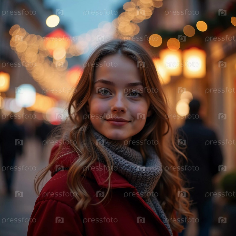 Потрясающая женщина мягко улыбается, пока снежинки падают вокруг нее в восхитительной городской обстановке, запечатлевая магию рождественского сезона. Красивая блондинка с длинными волосами. Генеративный ИИ