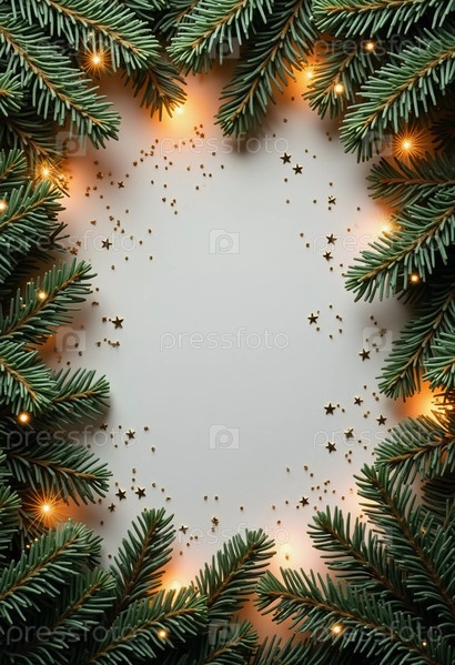 Еловые ветки создают праздничную границу, а разбросанные золотые звезды и огни усиливают радостную атмосферу рождественских и новогодних праздников, вызывая тепло и веселье. Генеративный ИИ