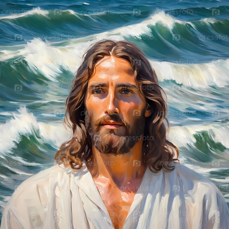 Христос на волнах. Портрет мужчины, одетого как Иисус. Белая мантия. Длинные каштановые волосы и борода. На вид мужчине около 30 лет, серьезное выражение лица. Христианская религия и вера. AI
