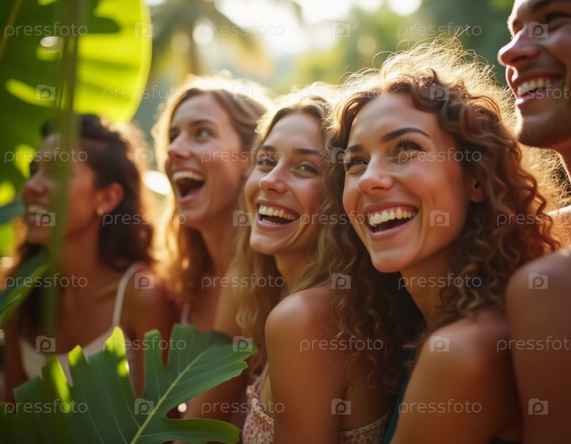 Друзья празднуют летний отдых в пышной тропической обстановке со смехом и улыбками среди яркой зелени. Тропики — это климатические зоны Земли, в которых Солнце находится в зените по крайней мере один раз в год. AI