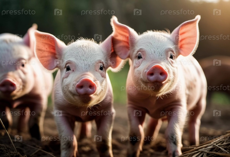 Милые поросята стоят вместе, их любопытные мордашки выражают игривую энергию под теплым солнечным светом. Игривая природа в солнечной обстановке фермерского двора. Милые поросята собрались вместе. Генеративный ИИ