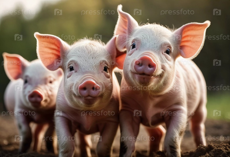 Милые поросята стоят вместе, их любопытные мордашки выражают игривую энергию под теплым солнечным светом. Игривая природа в солнечной обстановке фермерского двора. Милые поросята собрались вместе. Генеративный ИИ