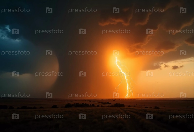 Потрясающая демонстрация необузданной мощи разворачивается, когда молния пронзает зловещее небо, освещая кружащуюся тьму торнадо во время штормовых сумерек на горизонте. Генеративный ИИ