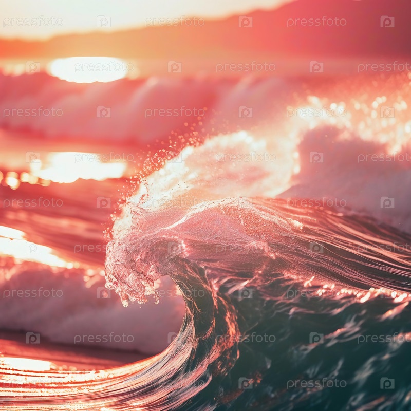 Когда солнце садится, волны мягко разбиваются о берег, их гребни переливаются оттенками розового и оранжевого