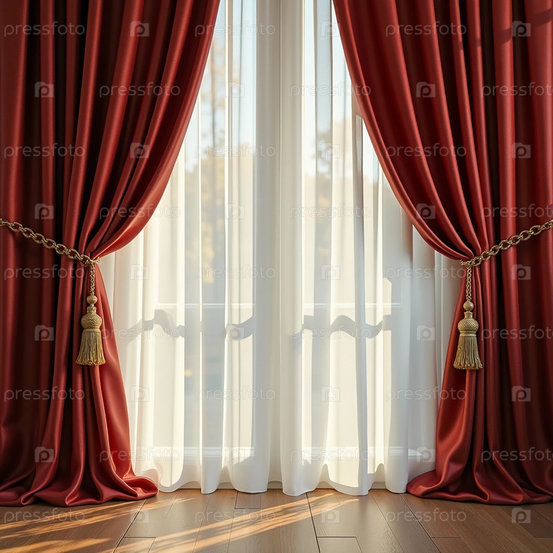 Богато окрашенные шелковые шторы элегантно висят, обрамляя наполненное светом окно. Роскошная ткань мягко драпируется, усиливая комфорт и красоту гостеприимного пространства Генеративный ИИ