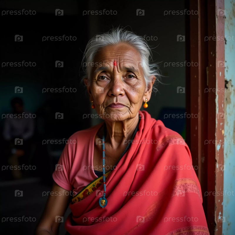 В уютной комнате пожилая женщина с гордостью носит яркое красное сари, демонстрируя свою грациозную осанку. Генеративный ИИ