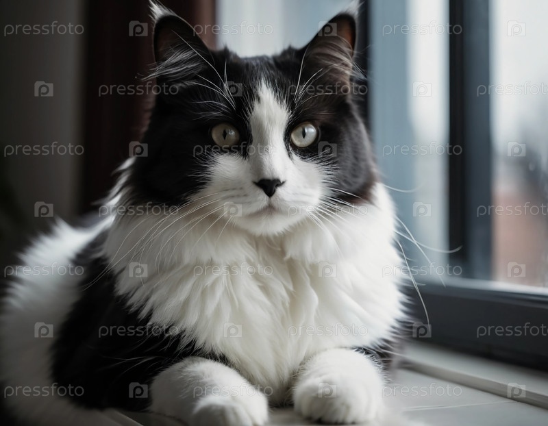 Грациозно расположившись на подоконнике, черно-белый кот наблюдает за миром снаружи. Солнечный свет проникает внутрь, подчеркивая его яркий мех и яркие глаза, создавая умиротворяющую атмосферу