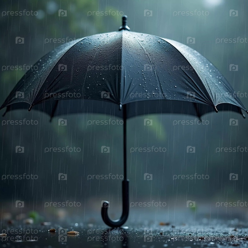 Черный зонтик стоит вертикально в луже, вокруг него идет сильный дождь. На заднем плане размытая зелень, усиливающая атмосферу типичного дождливого дня. Генеративный ИИ