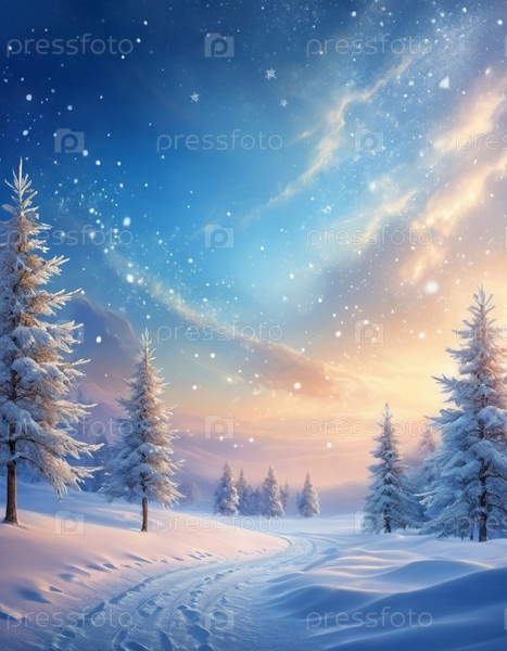 Живописная зимняя сцена с заснеженной равниной и силуэтами деревьев на фоне яркого закатного неба. Мягкий снегопад добавляет волшебный штрих, создавая спокойный и захватывающий дух пейзаж. Сгенерированный ИИ