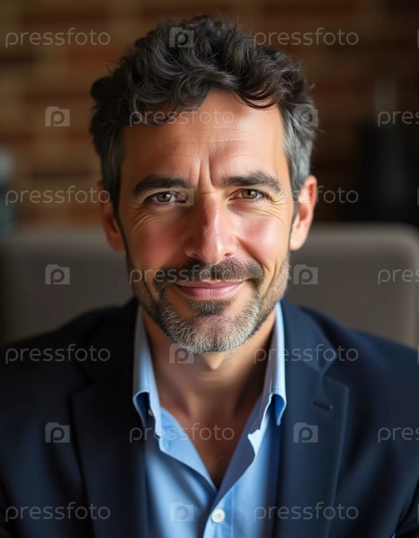 Мужчина-резидент из Израиля легко очаровывает теплой улыбкой, одетый в формальную одежду, на фоне гостеприимного деревенского декора. Атмосфера источает тепло и комфорт AI