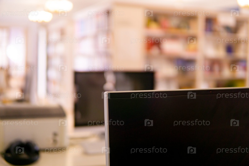 Размытый фон традиционной библиотеки с монитором компьютера на переднем плане и книжными полками