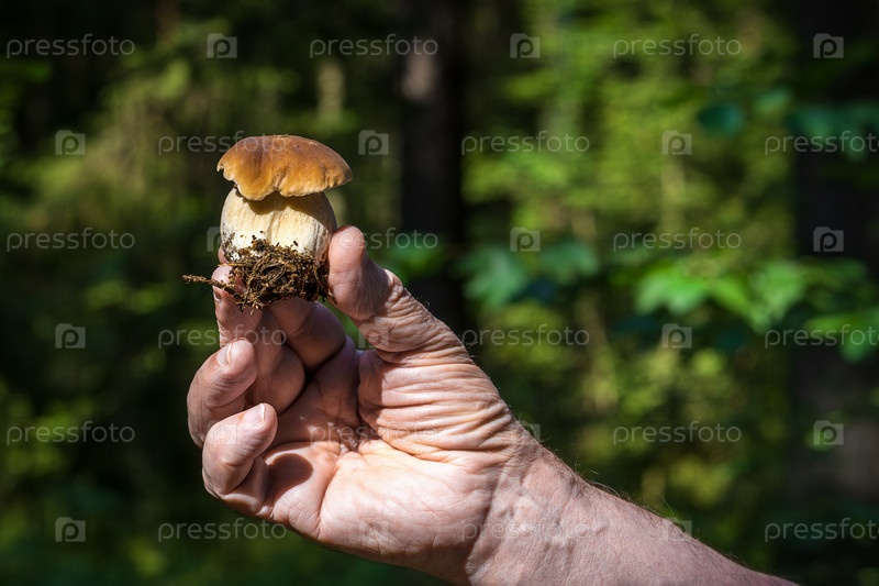 Рука держит свежесорванный гриб в лесу