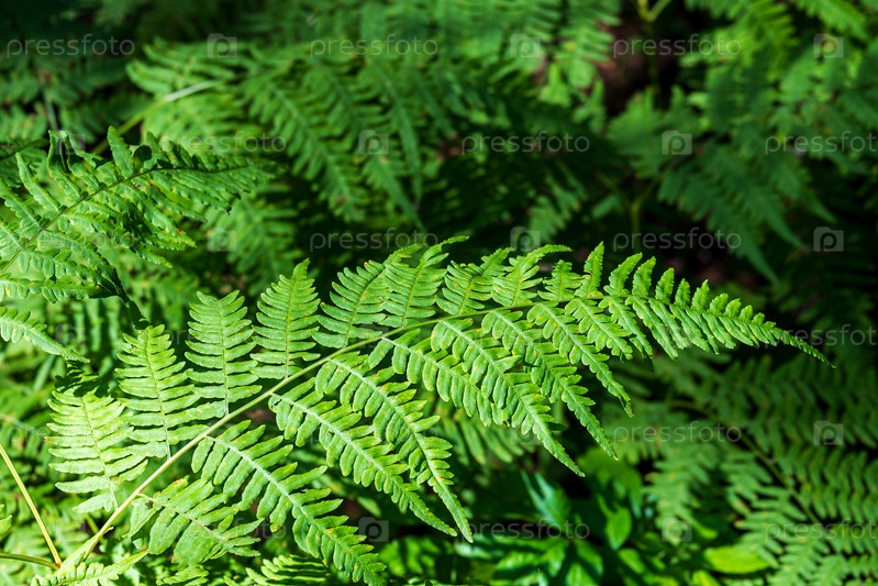 Пышные зеленые листья папоротника в залитом солнцем лесу