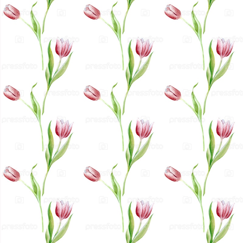 Акварельный бесшовный узор с розовыми тюльпанами на белом фоне. Нежные весенние цветы нарисованы вручную. Для свадебного декора, приглашений, открыток, упаковки, обоев, текстиля