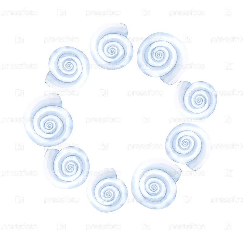 Акварельная круглая рамка из белых ракушек на белом фоне. Каждый элемент нарисован вручную. Морская тема. Иллюстрация для оформления продукции и торжеств в морском стиле