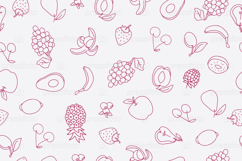 Бесшовный узор из свежих витаминных продуктов, фруктов и ягод. Здоровое питание в стиле doodle. Натуральная органическая еда. Вектор