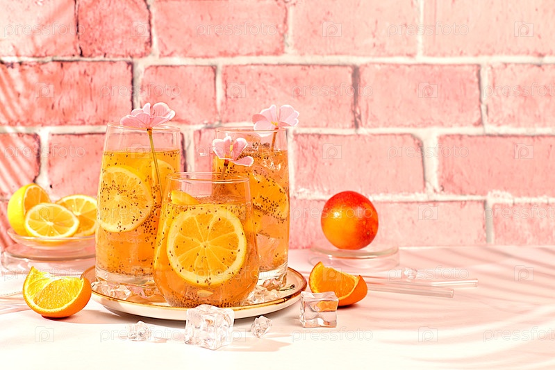 Диетический веганский коктейль с семенами чиа, апельсином, лаймом, фиалкой и льдом. Детокс-диета и концепция потери веса. Летняя вечеринка и реклама здорового образа жизни. Летний баннер и шаблон экрана