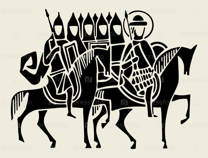 Векторный черно-белый рисунок со средневековой конной армией и святым князем