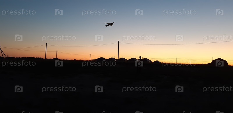 Вид с воздуха на сумерки: дрон летит над силуэтами палаток и людей на открытом воздухе