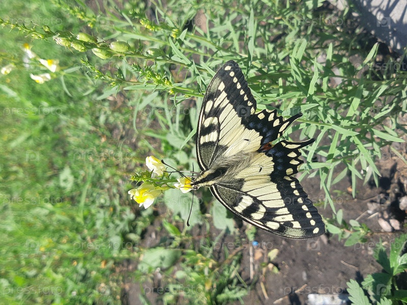 Красивая бабочка махаон, сидящая на цветке в пышном зеленом саду днем во время опыления