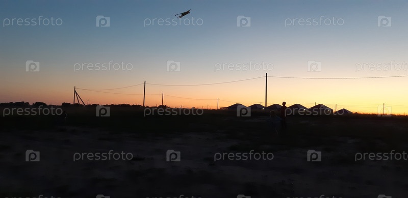 Дрон пролетает над полем на закате с силуэтом человека на переднем плане