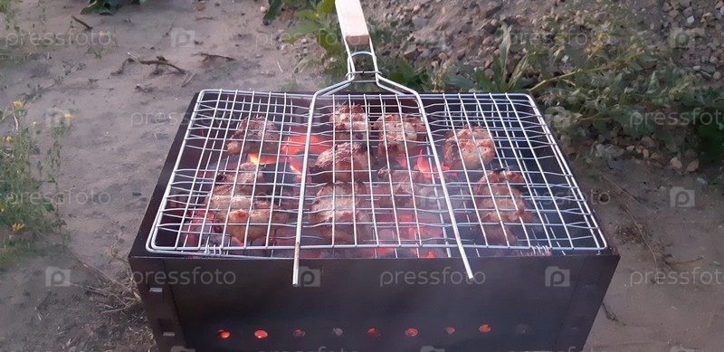 Жарка маринованного мяса на раскаленных углях на открытом воздухе во время заката