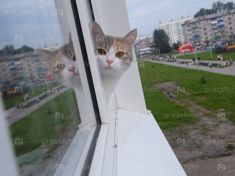 Любопытный кот наблюдает за оживленной улицей из окна в пасмурный день в жилом районе