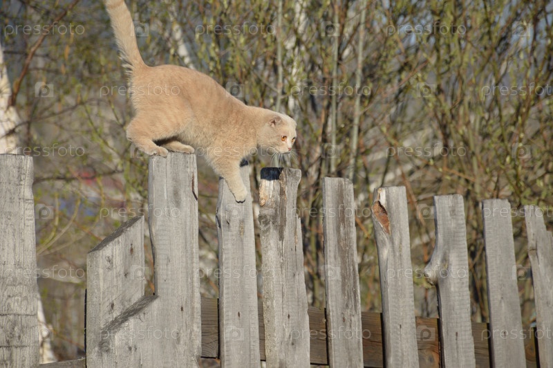 Бледный кот уверенно идет вдоль деревенского деревянного забора, окруженного зеленью, в солнечный день