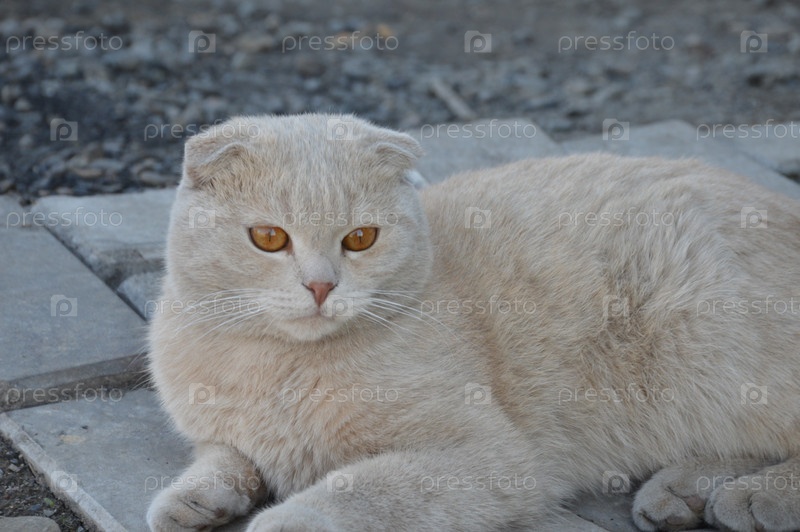 Милый светлый кот с яркими глазами отдыхает на каменном тротуаре в саду при дневном свете
