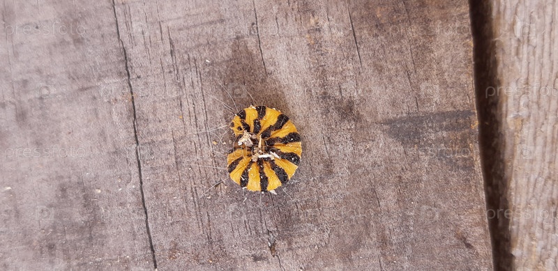 Яркое полосатое насекомое отдыхает на деревянной поверхности в естественной обстановке на открытом воздухе в дневное время