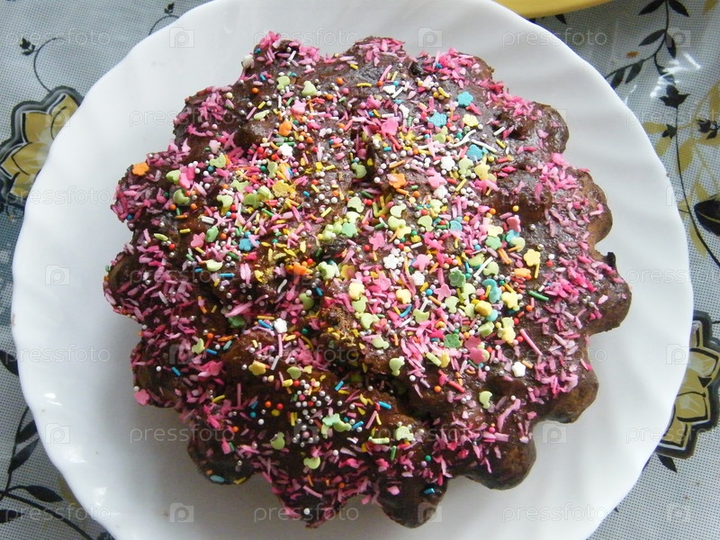Вкусный шоколадный торт, украшенный разноцветной посыпкой на белой тарелке в яркой кухонной обстановке