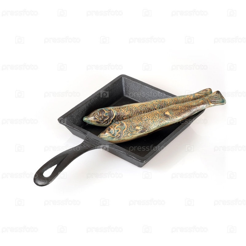 Юмористическая концепция нескольких рыб (керамика) на сковороде, изолированных на белом фоне