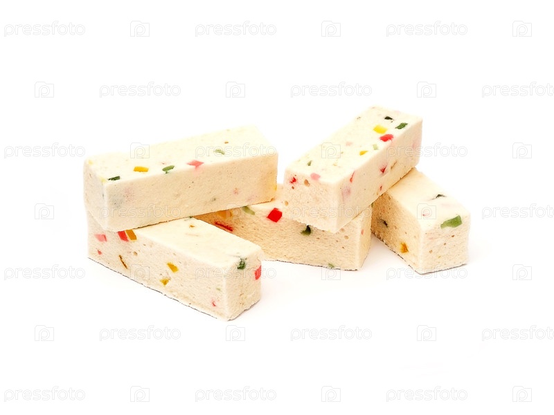 Несколько кусочков палочек из яблочного маршмеллоу с мармеладом, изолированных на белом фоне