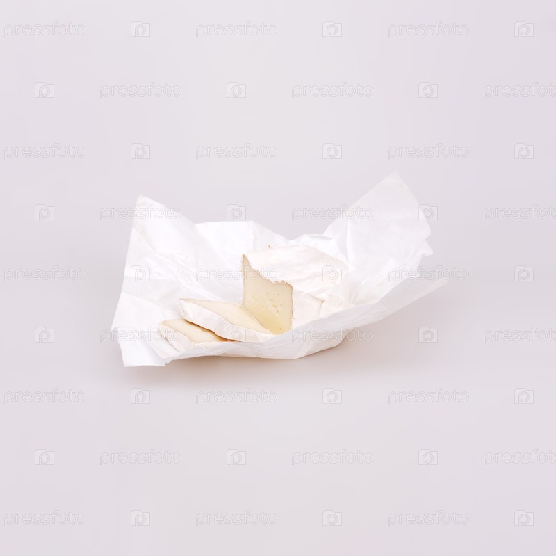 Кусочек мягкого сыра, завернутый в бумагу, изолированный на белом фоне