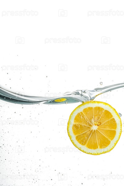 Лимон падает в воду с пузырьками и брызгами на изолированном фоне макета