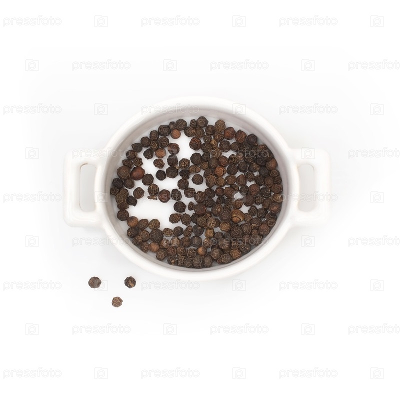 Черный перец горошком в белой посуде, изолированной на белом фоне