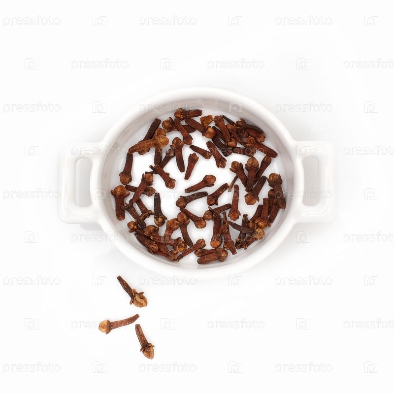 Сушеные гвоздики в белых блюдах, изолированные на белом фоне